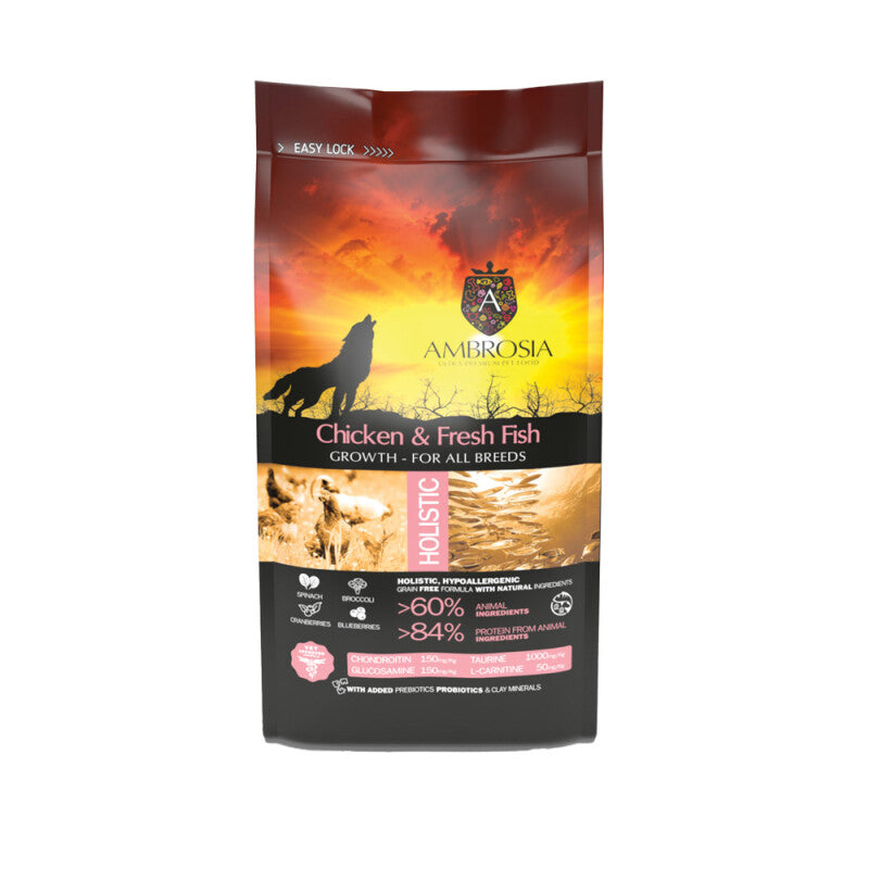 Ξηρή τροφή σκύλου Ambrosia Grain Free Dog Growth Chicken & Fresh Fish με κοτόπουλο και φρέσκα ψάρια. Ολοκληρωμένη ολιστική τροφή για κουτάβια χωρίς δημητριακά.