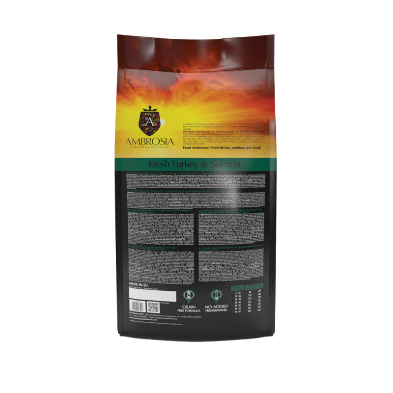 Ξηρή τροφή σκύλου Ambrosia Grain Free Dog Senior - Light - Sterilized Fresh Turkey & Salmon.Ολοκληρωμένη τροφή για υπερήλικους, υπέρβαρους και στειρωμένους σκύλους.